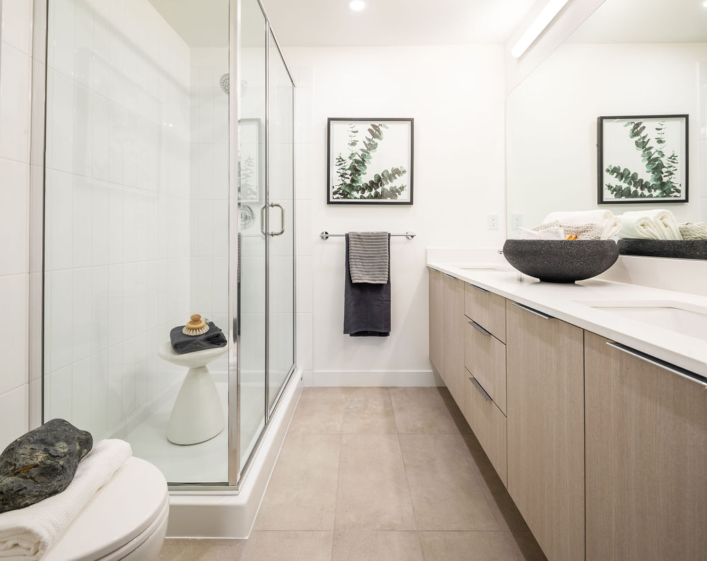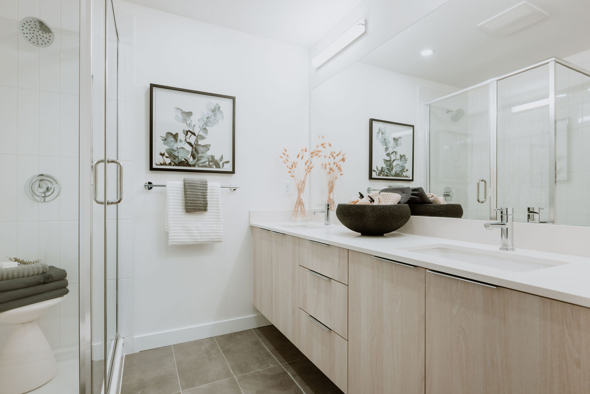 - Semi-floating vanities and plenty of counter space in bathrooms