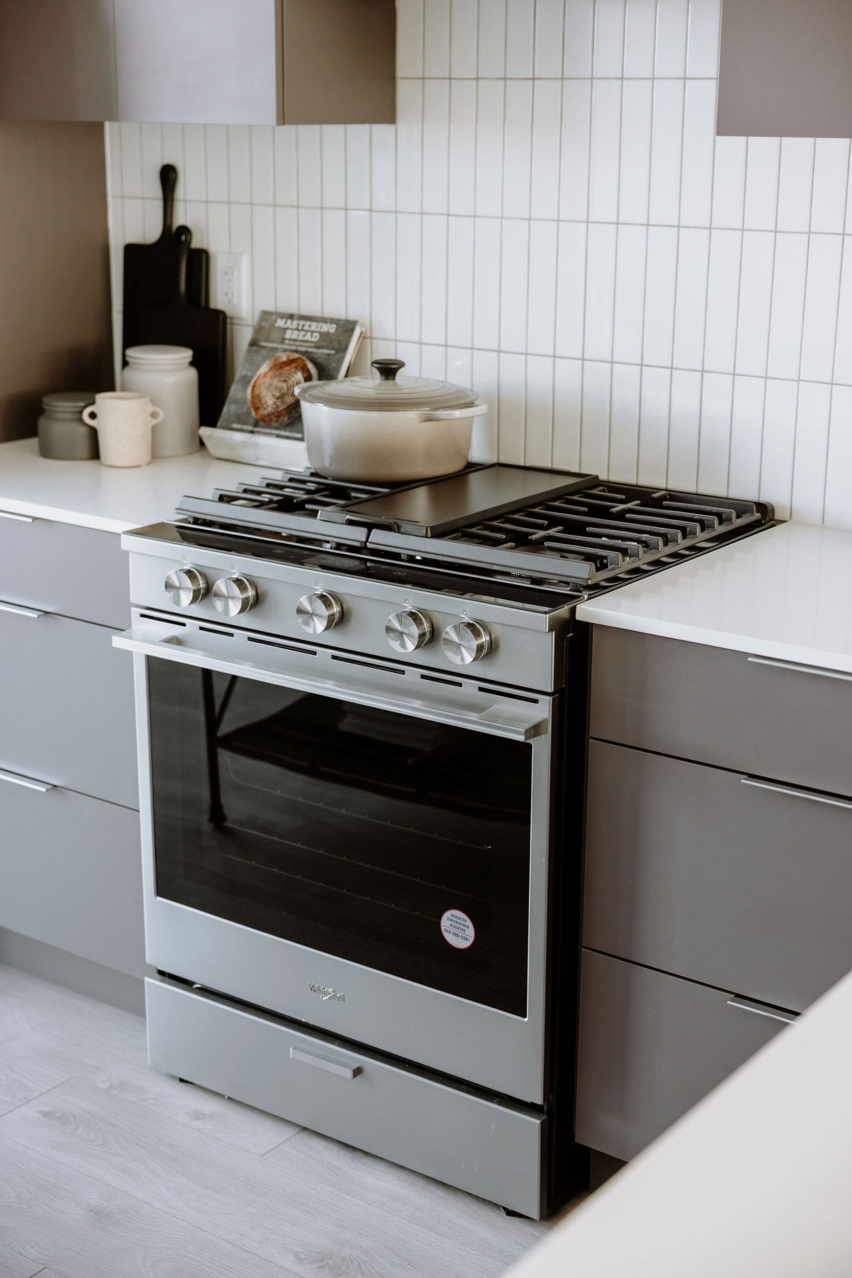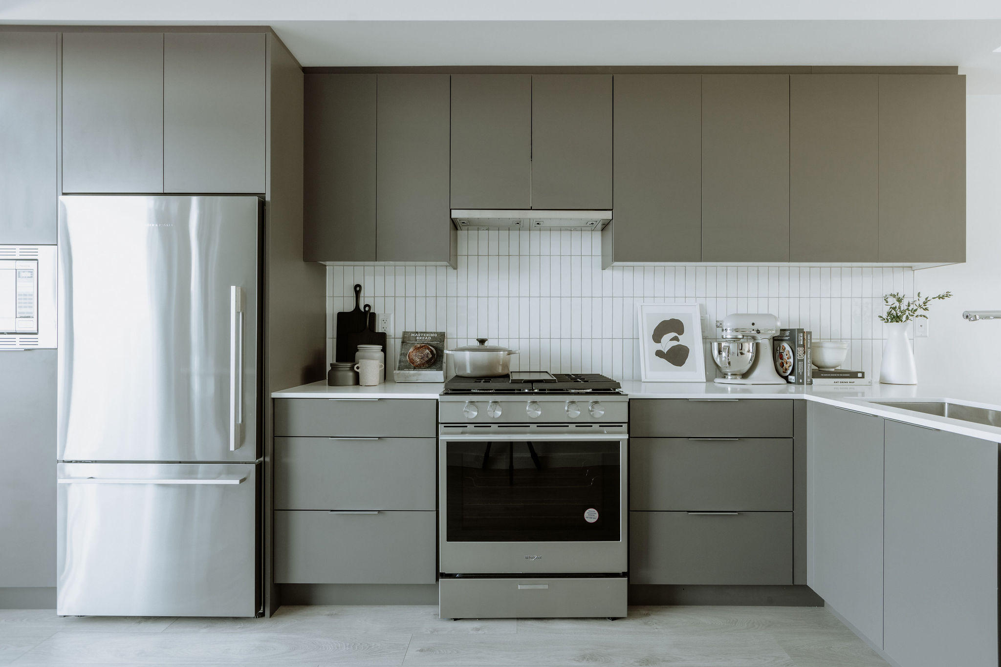 - Deluxe modern kitchen with gas range and stainless steel appliance package including refrigerator, dishwasher, and slide-out hood fan