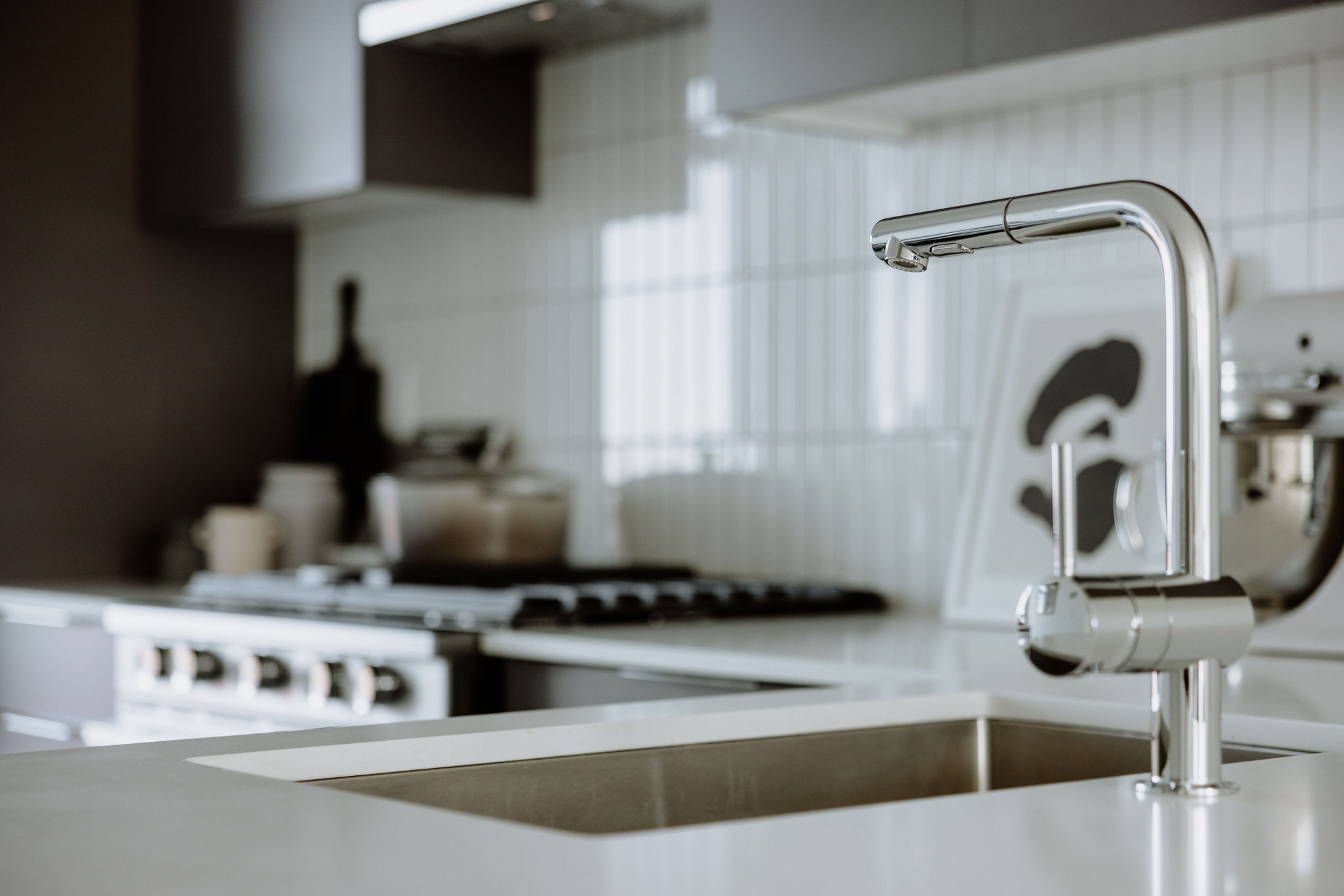- Modern vertical stacked tile backsplash and white quartz countertop in kitchen