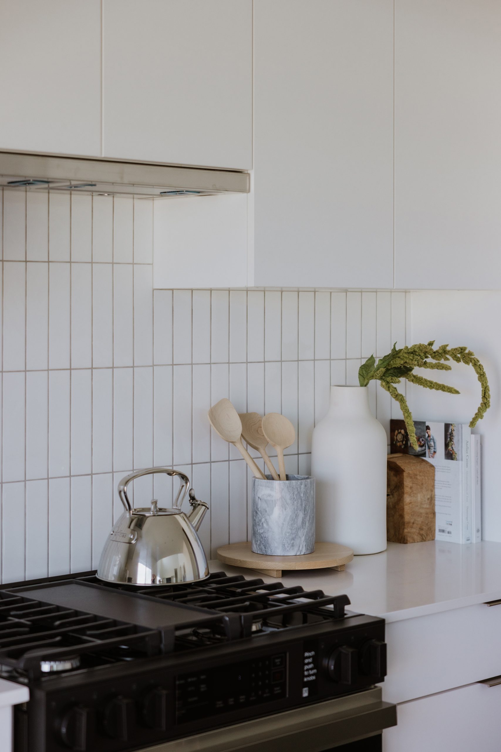 Bright white cabinets are paired with a matching vertical tile backsplash and sleek quartz countertops, all beautifully complemented by pale oak laminate flooring for a clean and contemporary look.