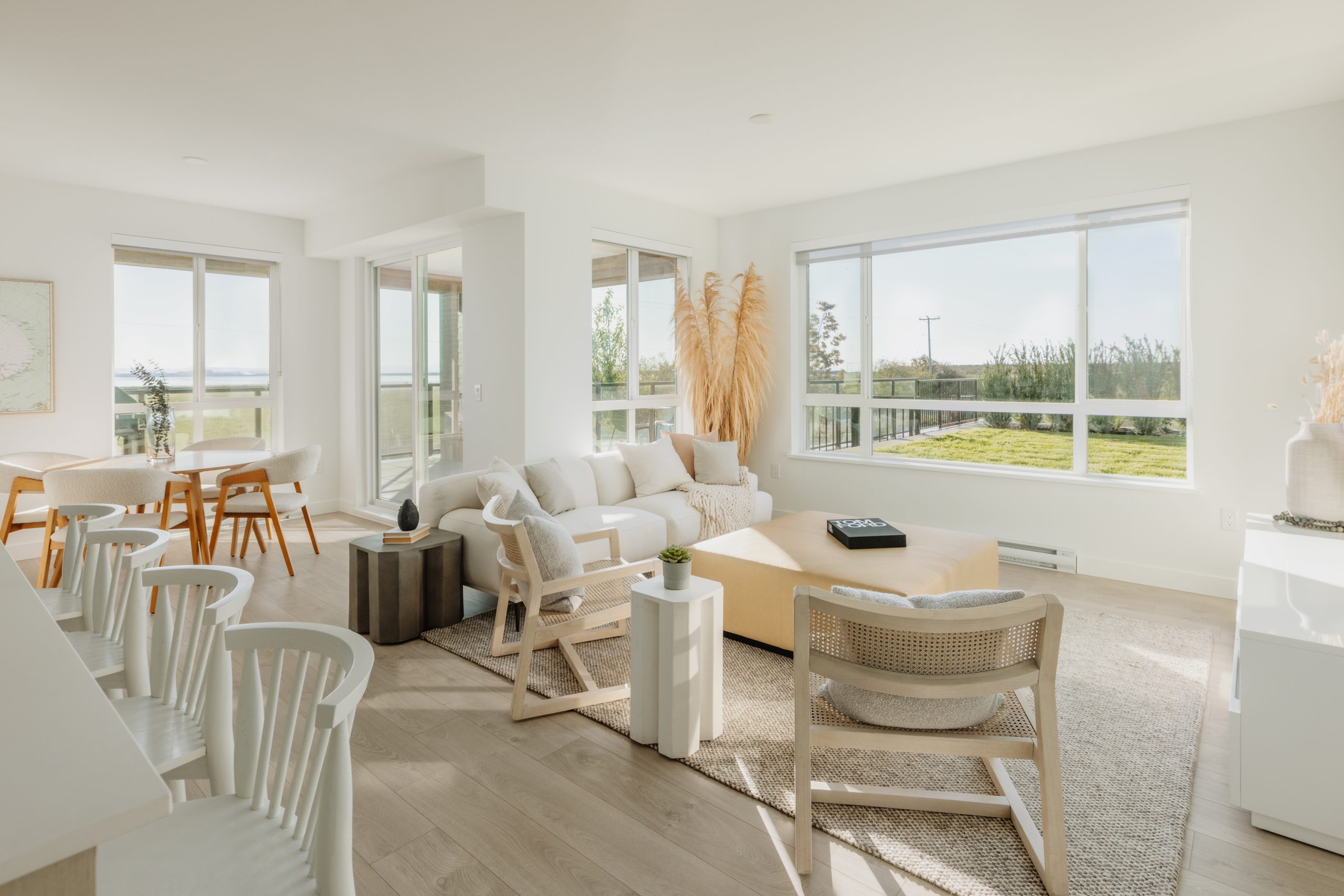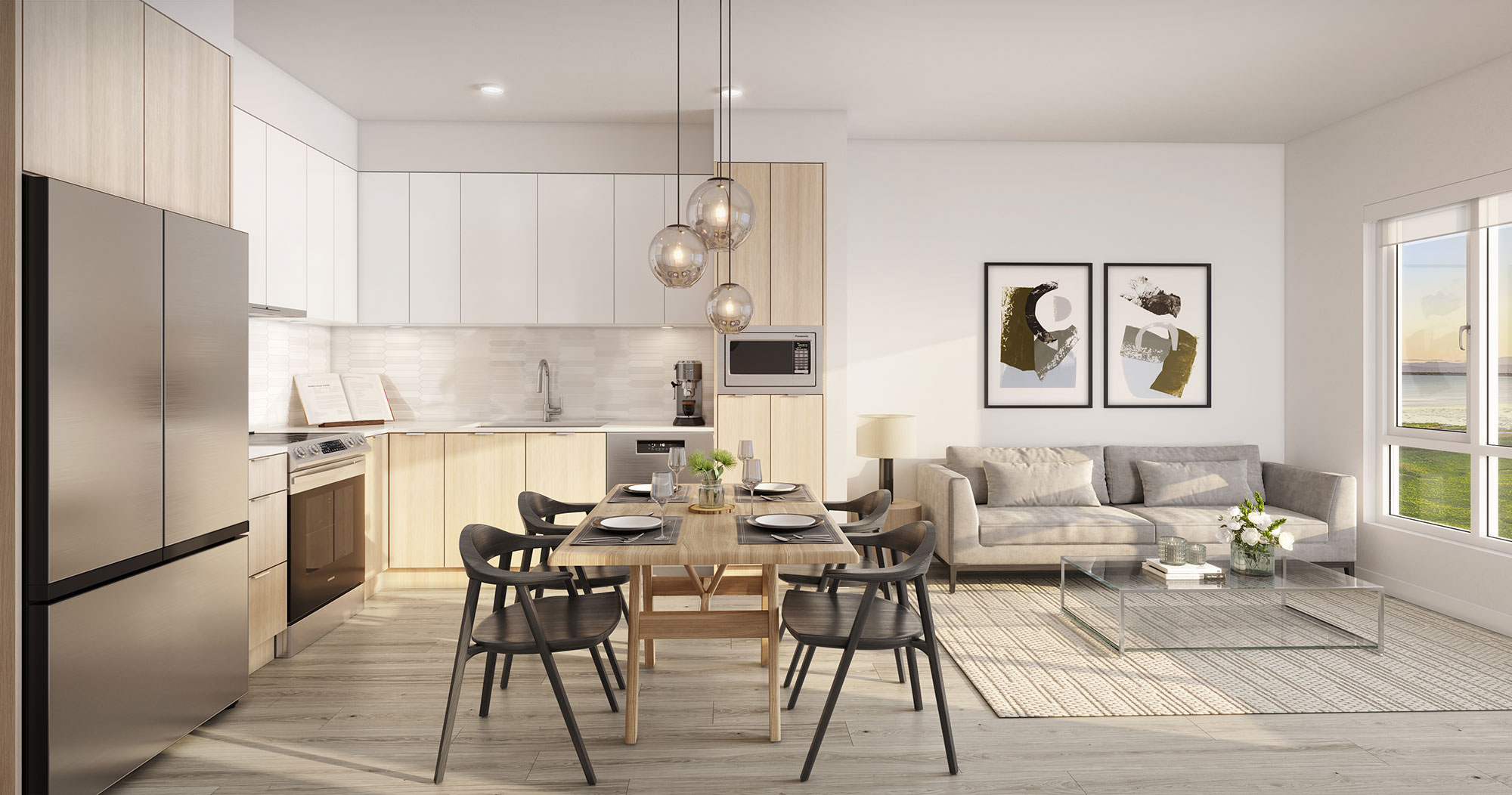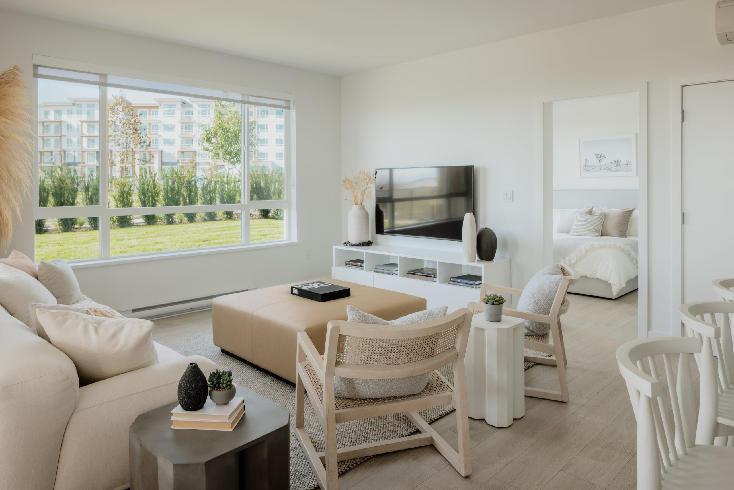 Step inside to bright, open spaces inspired by the coastline, with your choice of Beach or Ocean designer schemes and natural laminate wood flooring. Stylish finishes, full-size laundry, and electric heating add comfort, with options for in-suite cooling and a complimentary one-year TELUS internet and TV package.